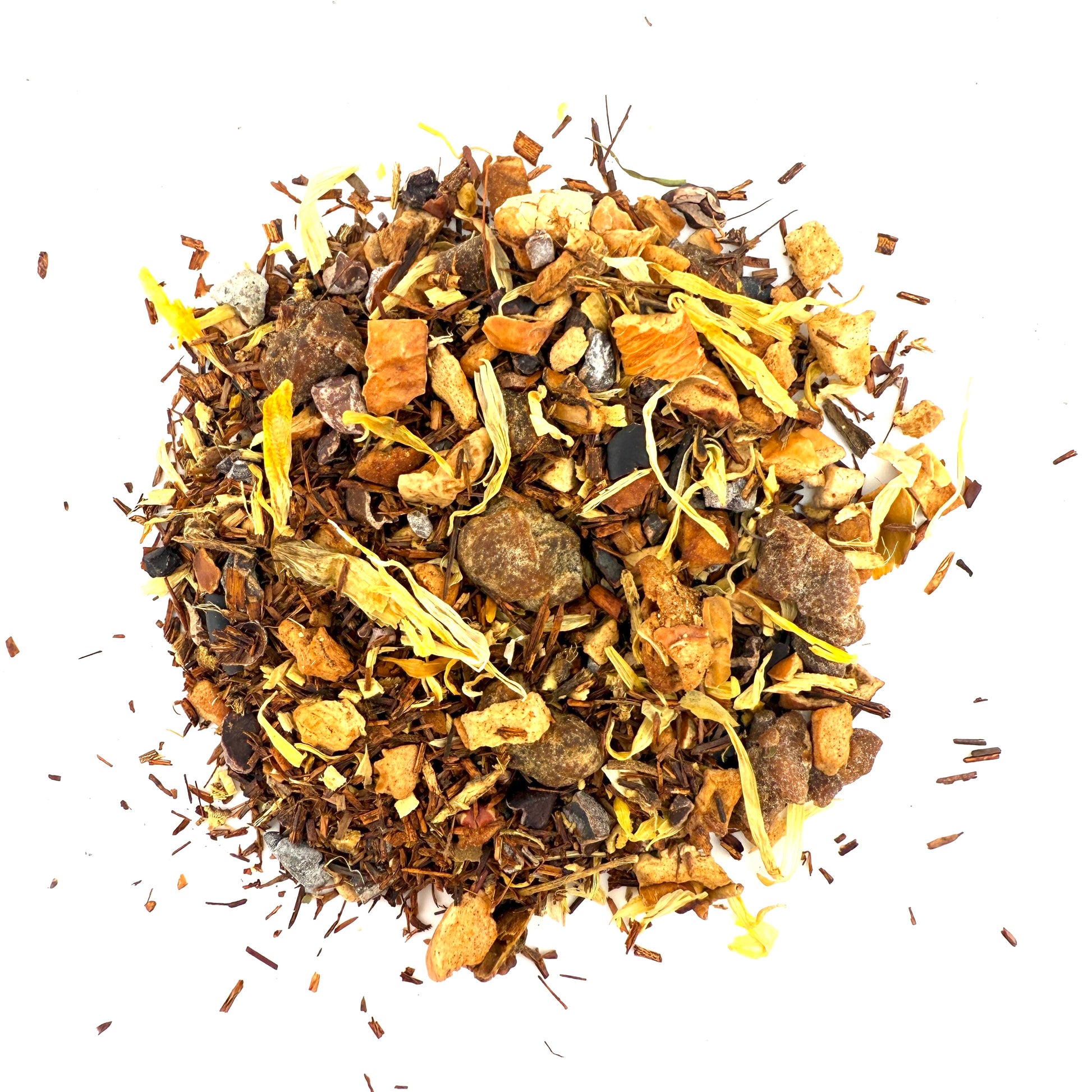 Ingredients: Rooibos, apple, cocoa bean pieces, banana, licorice, calendula petals, natural flavors.