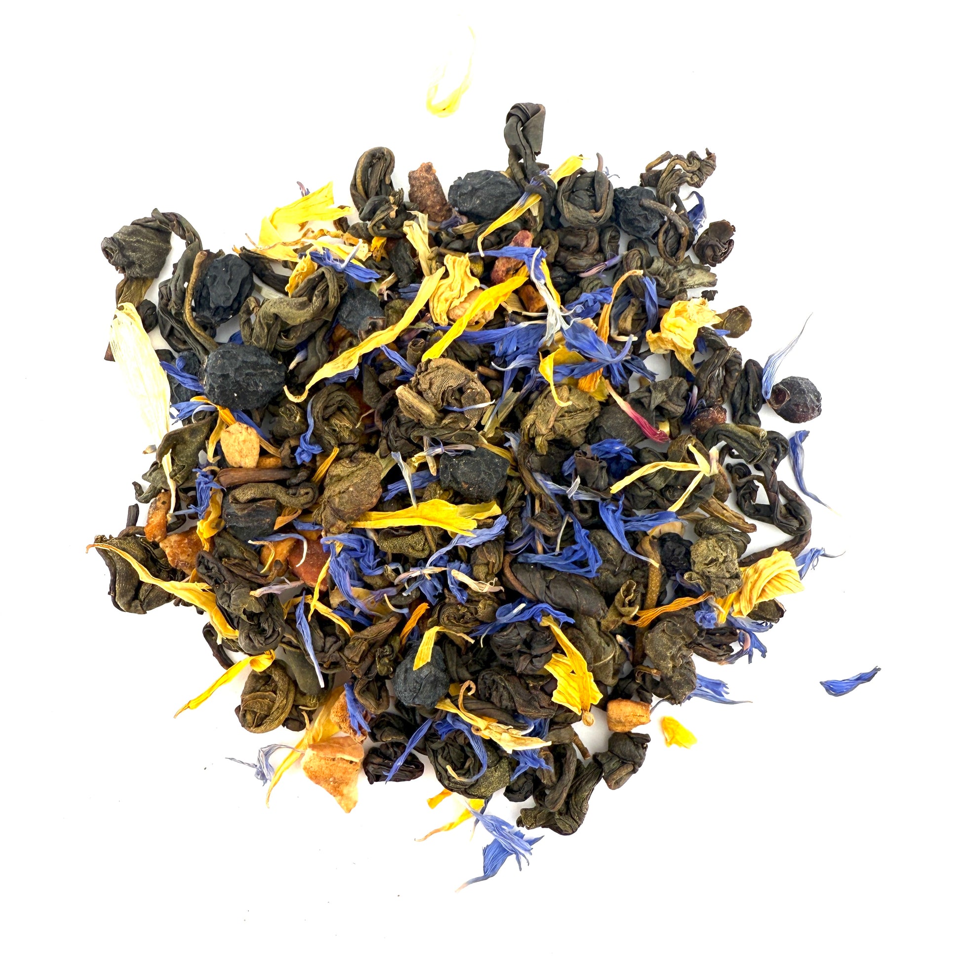 Ingredients: Green tea, apple pieces, blueberries, calendula petals, cornflower petals, sunflower petals, natural flavors (organic compliant).