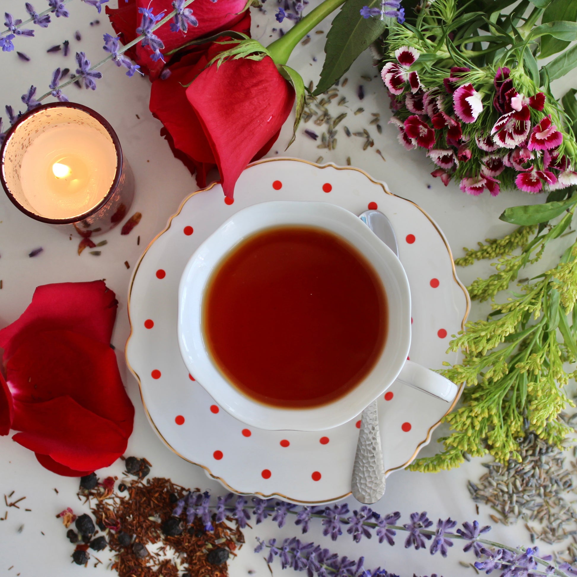 Ingredients: Rooibos, rosehip, elderberry, blueberry pieces, lavender petals, rose petals, natural flavors.