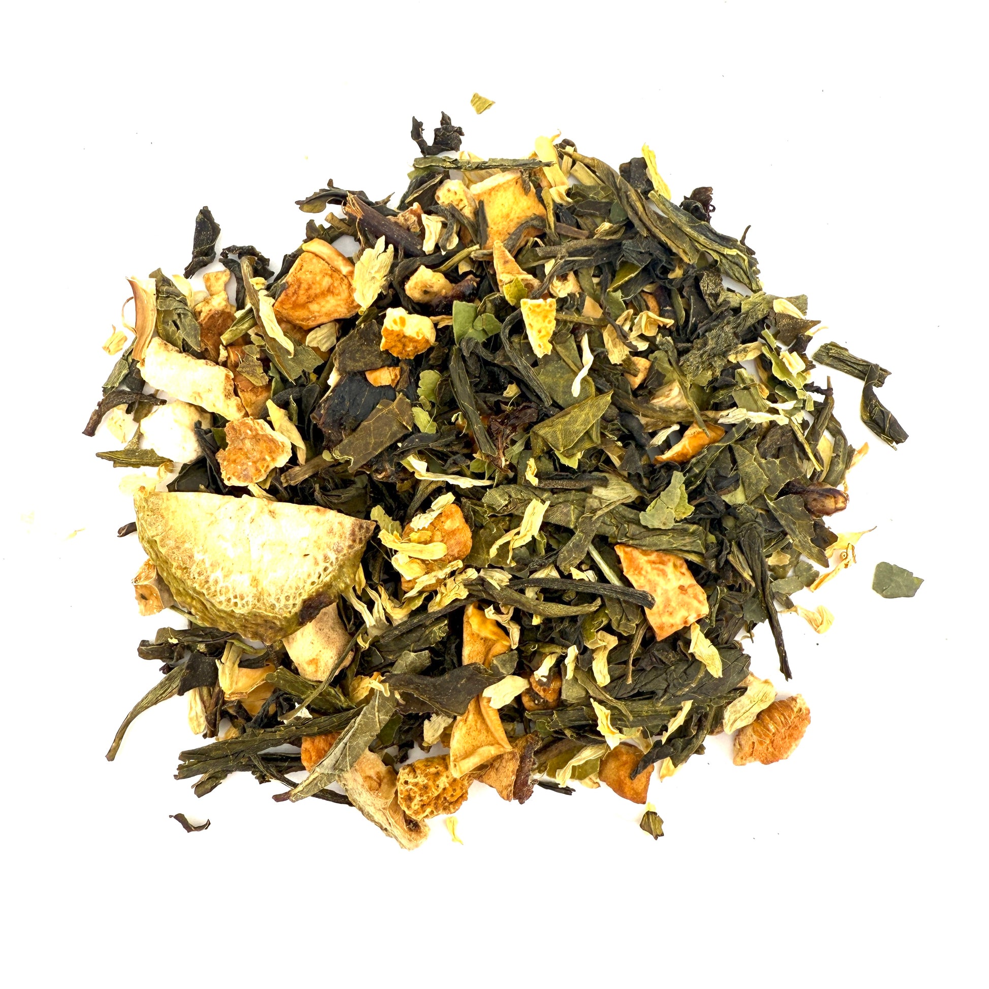 Ingredients: Green tea, apple, lemon pieces, lime pieces, lime leaves, chamomile petals, natural flavors (organic compliant).