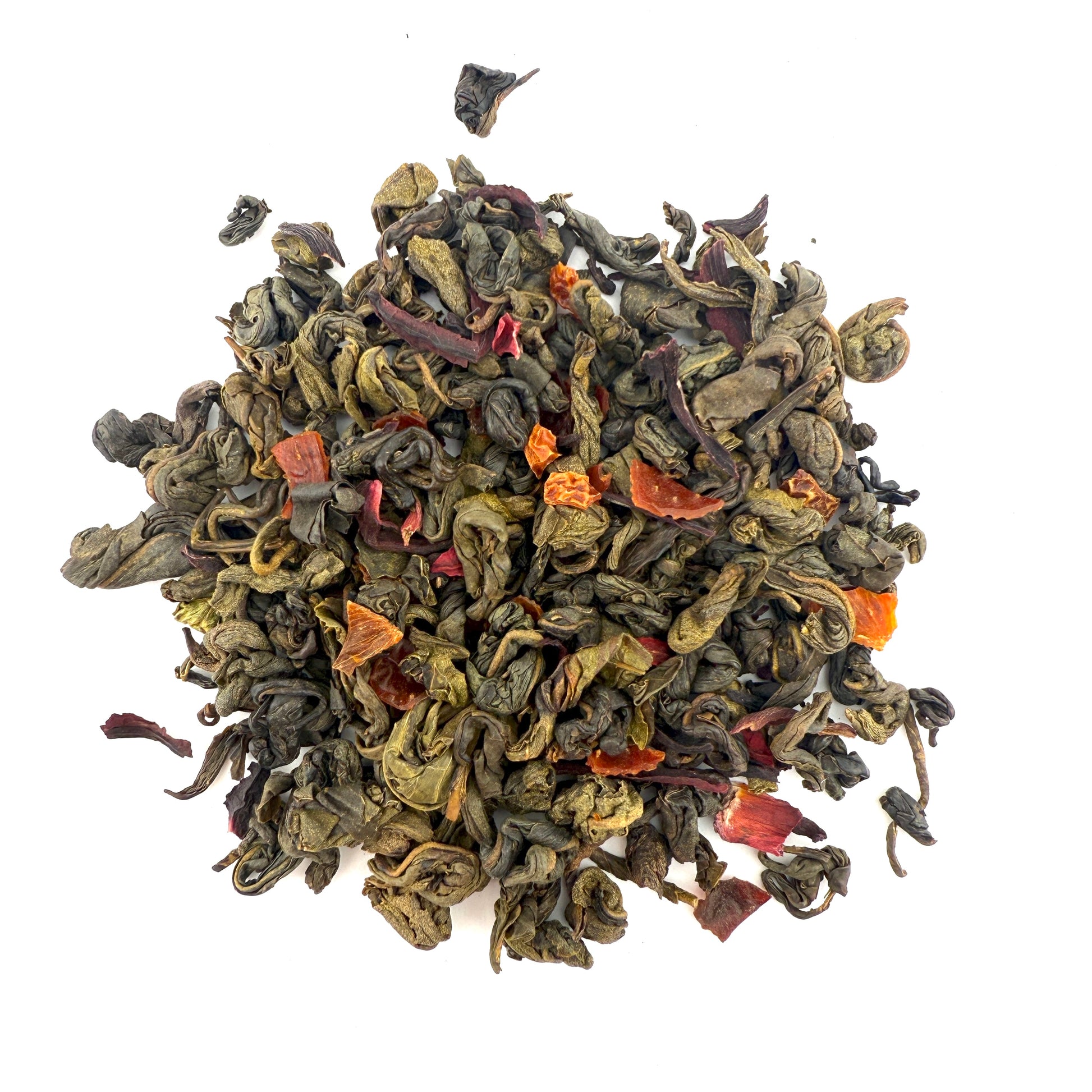 Ingredients: Green tea, rosehip pieces, hibiscus petals, natural flavors (organic compliant).