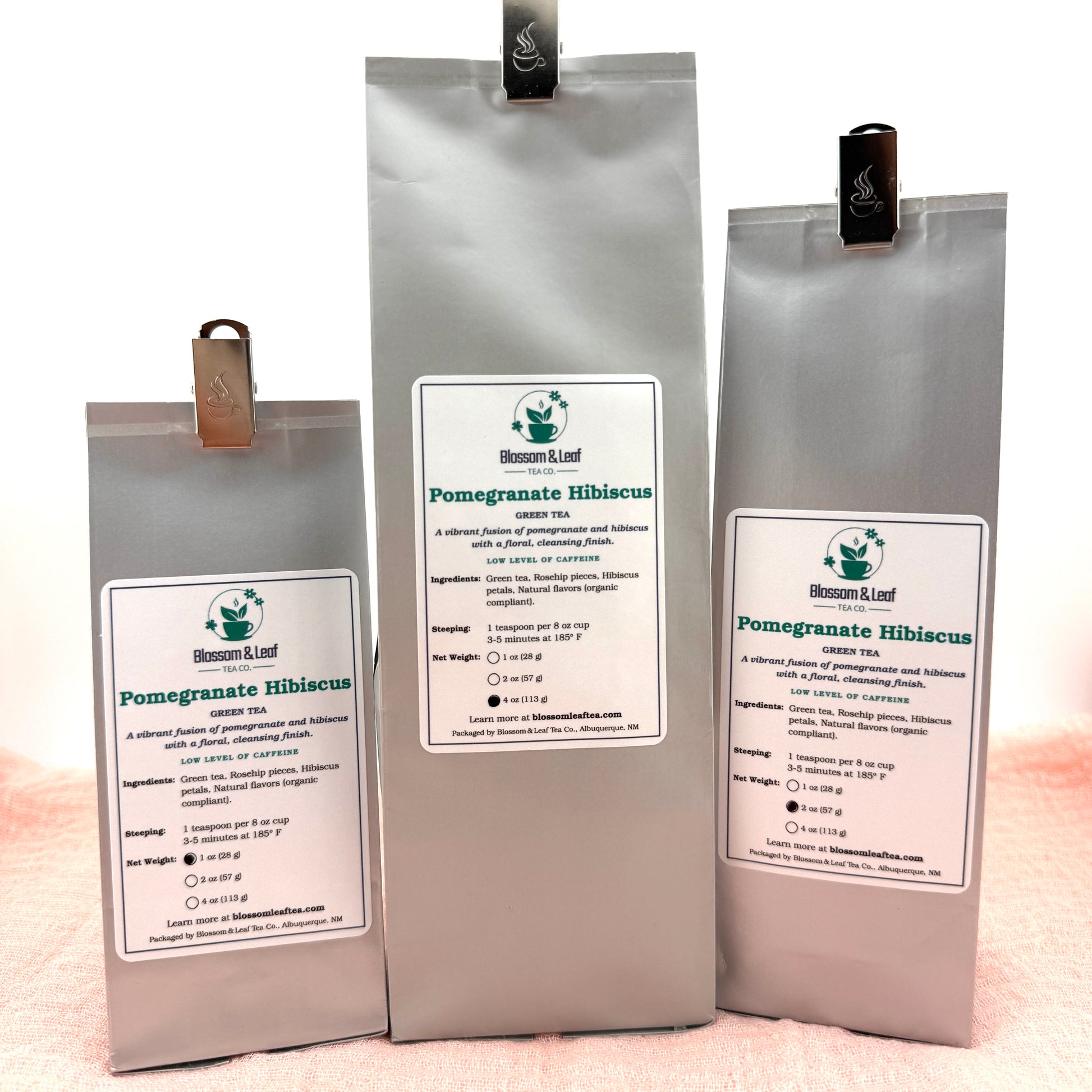 Crisp green tea lifted with tart pomegranate and hibiscus for a ruby-bright refresh. Notes: pomegranate, hibiscus, red fruit.