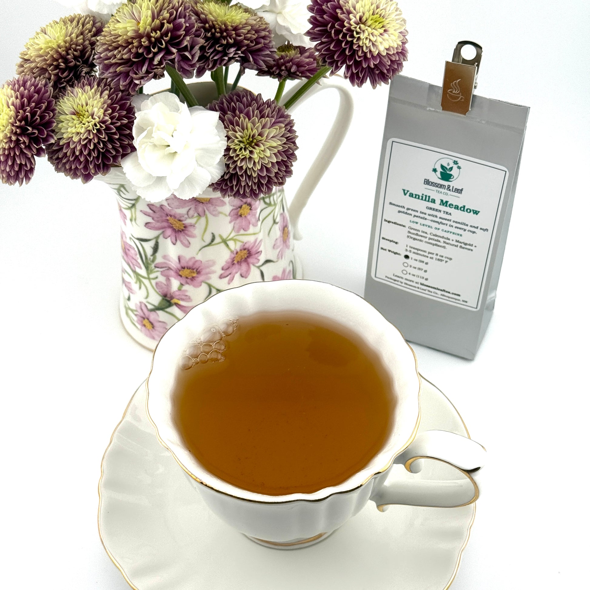 Soft green tea with warm vanilla and meadowy florals—calm, smooth, lightly sweet. Notes: vanilla, soft blossom, gentle green.